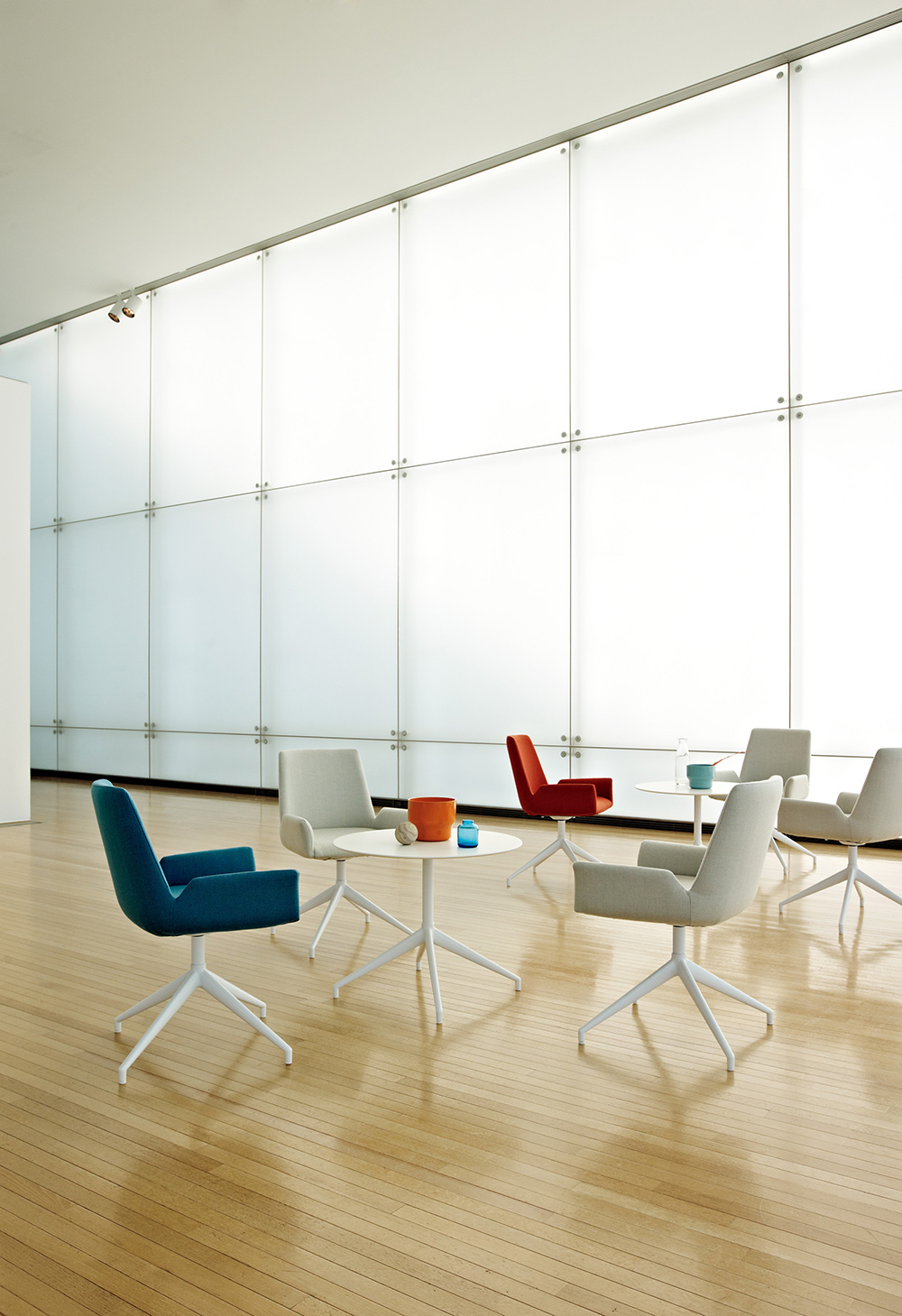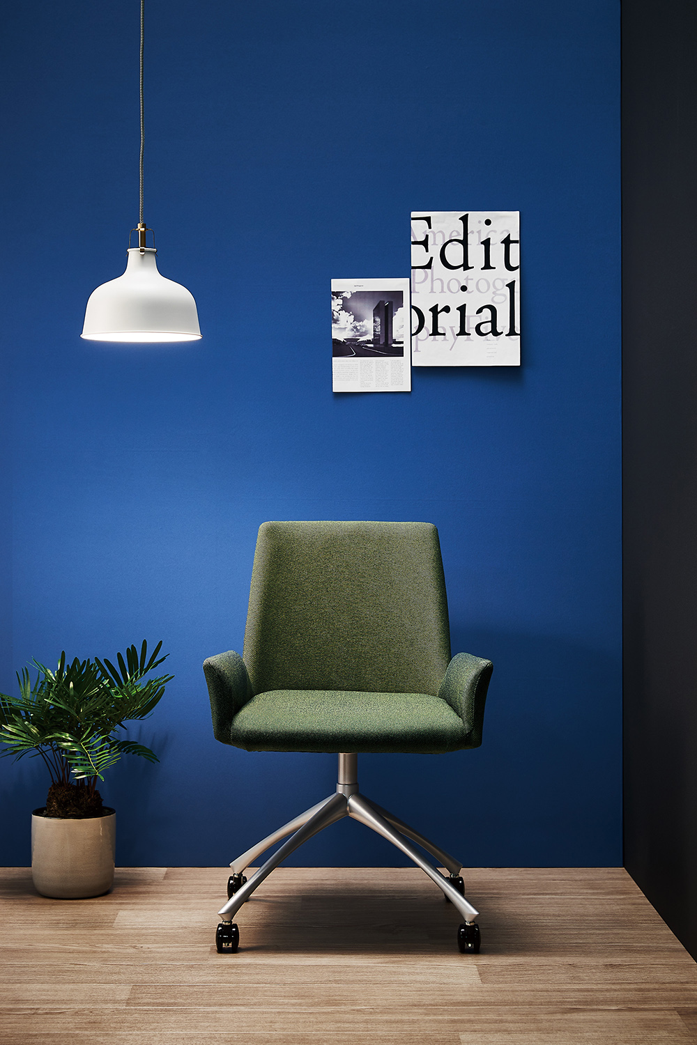 Divina MDは、見る角度によって色の深みが美しく変化するメランジュ色が特徴です。平織した布に水と熱を加えて加工し、糸を収縮させることで生まれるフェルトのような魅力的な質感は、滑らかで触り心地がよく、耐久性に優れています。素材には上質な天然ウールを100%使用。汚れにくく、難燃性と耐光性の特徴も合わせ持ち、張り上げた時の美しさは、家具そのものや空間をアップグレードしてくれる気品を漂わせています。伸縮性に優れているため、一般的な生地では難しい有機的なフォルムの家具にもご使用いただけます。