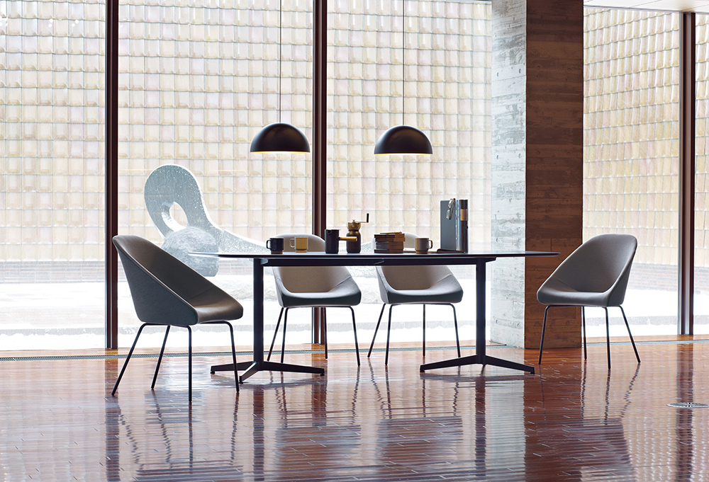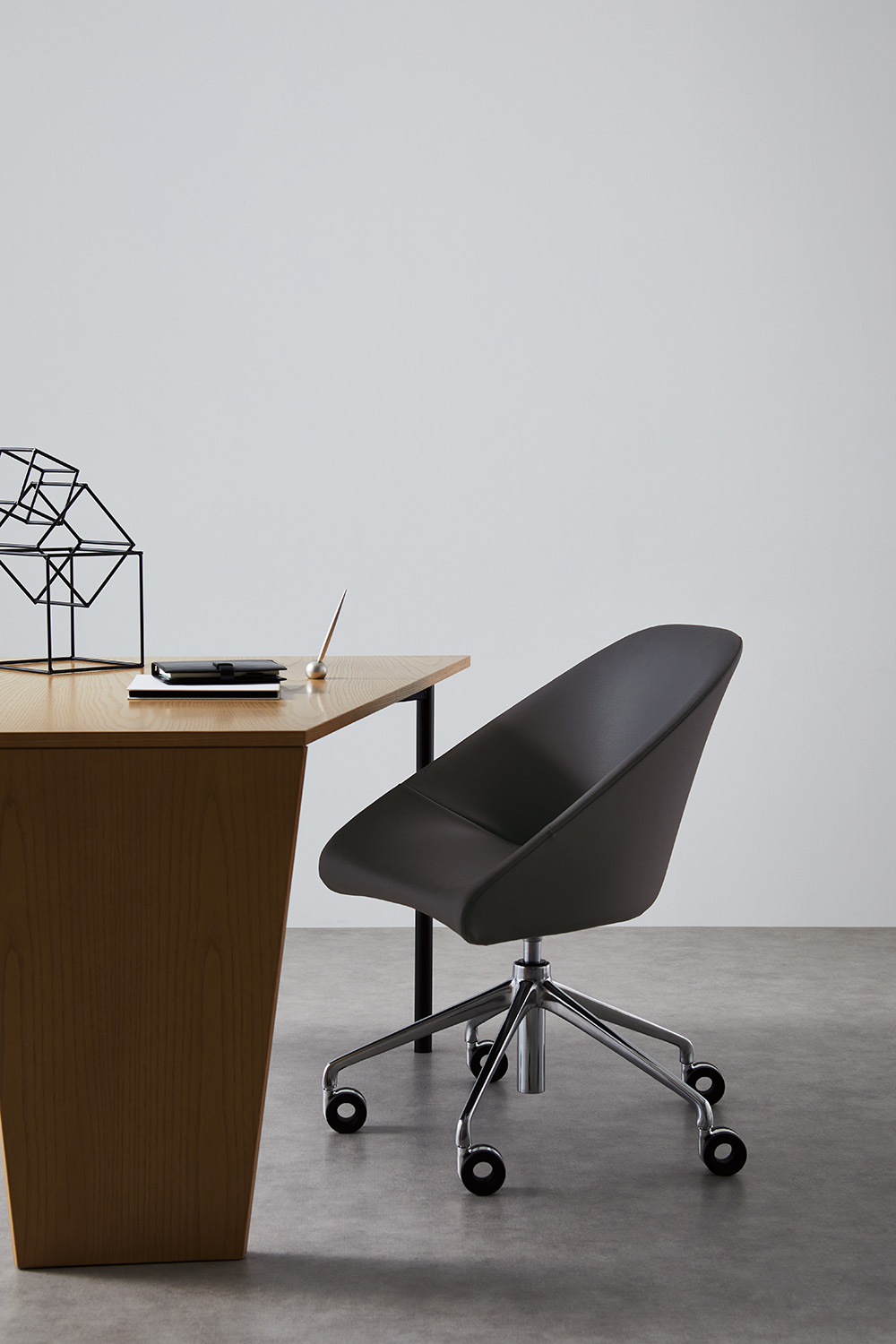 モールドウレタンの自由な造形力で、布を張りつめたようなしなやかな曲面を実現。緊張感を漂わせながらも角には丸みがあり、仕上がりはコンパクトに。深く腰掛けると姿勢正しく、背にもたれると曲面へのフィット感が得られます。ガス昇降機能を搭載したGCSは鏡面仕上げとマットなブラック粉体塗装仕上げをご用意。