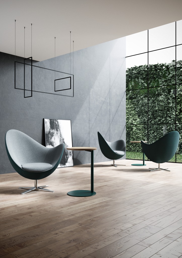 Divina MDは、見る角度によって色の深みが美しく変化するメランジュ色が特徴です。平織した布に水と熱を加えて加工し、糸を収縮させることで生まれるフェルトのような魅力的な質感は、滑らかで触り心地がよく、耐久性に優れています。素材には上質な天然ウールを100%使用。汚れにくく、難燃性と耐光性の特徴も合わせ持ち、張り上げた時の美しさは、家具そのものや空間をアップグレードしてくれる気品を漂わせています。伸縮性に優れているため、一般的な生地では難しい有機的なフォルムの家具にもご使用いただけます。