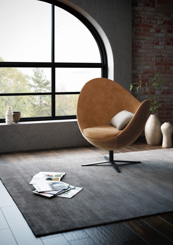 360度どこから見ても美しいそのプロポーションは、柔らかさをテーマにスカートの裾やゆらめく炎(=Flame)をイメージしてデザインされました。大小二つの山と広々とした座面の開口は座る方向を定めず、程よい閉塞感と開放感を与えます。スタイリッシュな外観とは裏腹に、内側のクッションは柔らかく、包み込まれるような座り心地です。