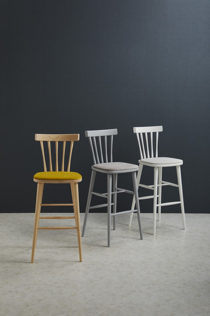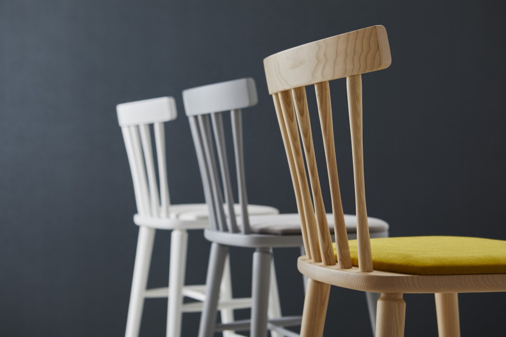 カウンターに並べたときにも細くくびれた背面のくびれたスポークが軽やかさを感じさせます。木製で淡くナチュラルなカラーのスタンドチェアが、柔らかな空間を演出。ホワイトナチュラル、ライトグレー、ホワイトの3種類のカラーバリエーションをご用意しています。