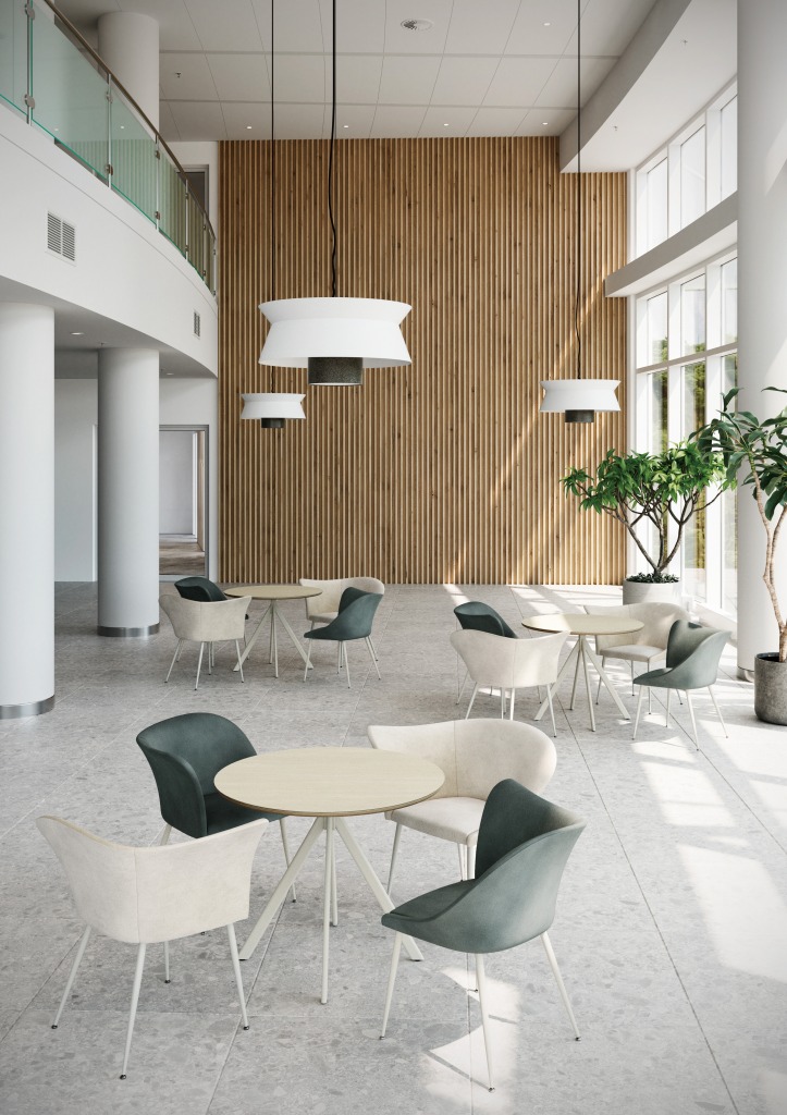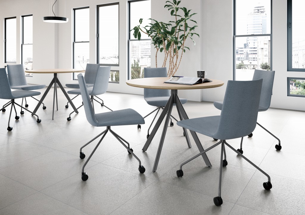 ネクスマは人と人との繋がりがアイデアを生み、テーブルを中心にコミュニケーションが広がるようなイメージでデザインされました。太めの角パイプから細い楕円管が抜きでたようなデザインは植物の幹から根が広がる様子をデザインのモチーフとしています。天板はメラミンとリノリウムをラインナップしています。